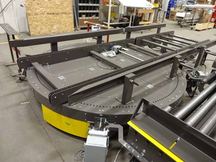 Bàn xoay tải lớn cũng thường thấy trong các hệ thống nâng chuyển con lăn, với hệ thống đóng gói pallet cho vật liệu xây dựng, thực phẩm. Khi sản phẩm được chất lên cao và được quấn màng trước khi lưu kho và đưa ra thị trường.